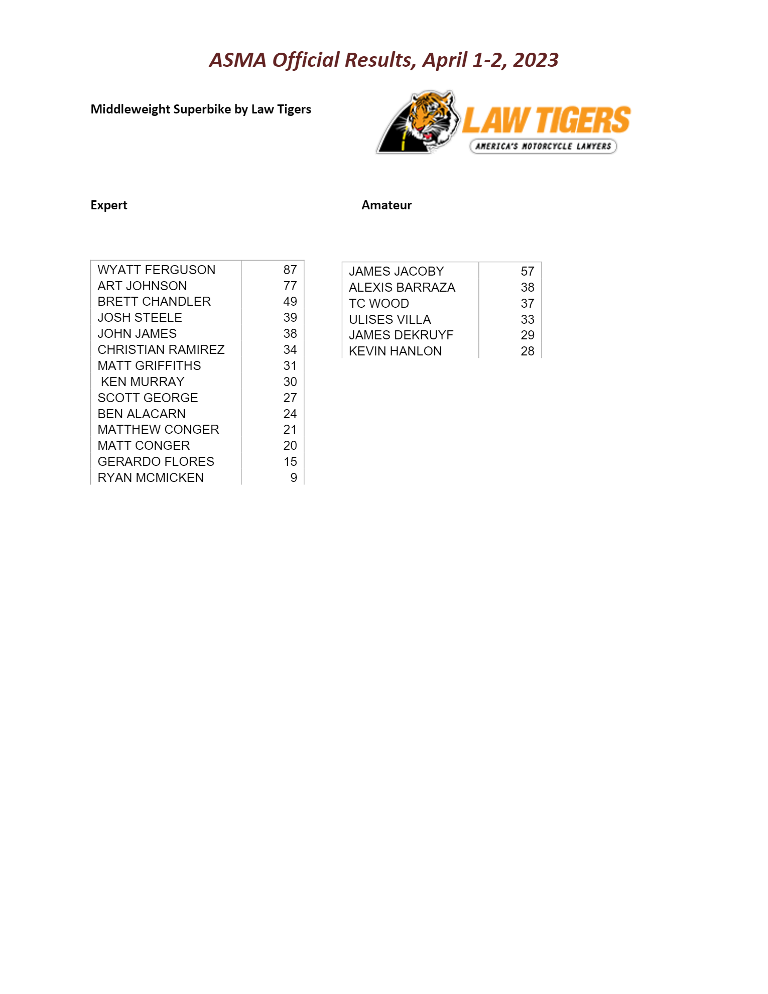 Current Expert Middleweight Superstock and Middleweight Superbike Points Champion for ASMA